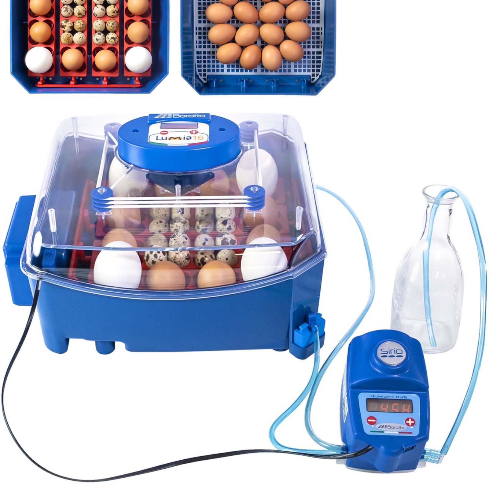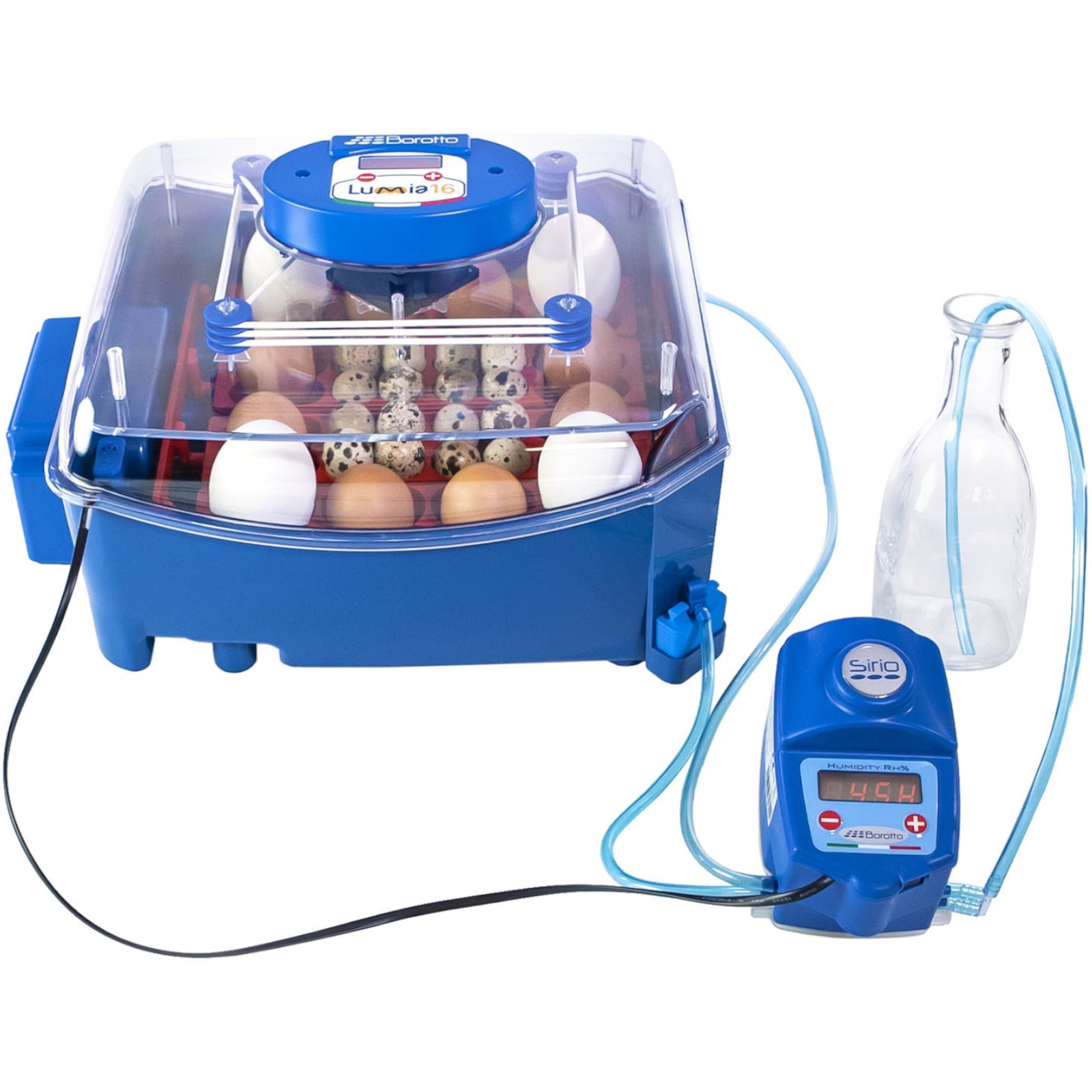 Inkubator do jaj marki Borotto nadaje się do wylęgu jaj kur, bażantów, perliczek, przepiórek, kuropatw, kaczek, gęsi, pawi, gołębi oraz różnych ptaków egzotycznych i drapieżnych. We wnętrzu można inkubować jednocześnie 16 jaj kurzych lub 64 przepiórcze. Termostat oparty o algorytm typu PID zapobiega wahaniom temperatury i dba o jej stały poziom (+/- 1C). W zależności od gatunku ustawia się ją w zakresie 30-40C. Parametr jest widoczny na czytelnym wyświetlaczu LED. Konstrukcja z odpornego na ciepło polimeru ABS, doskonale izolującego wnętrze wylęgarki. Dzięki dodatkowi jonów srebra BIOMASTER materiał ogranicza rozwój bakterii, co zapobiega ewentualnym infekcjom zarodków. Opatentowany system nawilżania SIRIO pozwala utrzymać idealny poziom wilgotności. Wynosi on 45-55% z wodą na jednej tacce, 60-65% na dwóch.