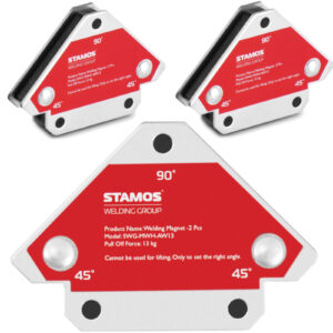 Kątownik spawalniczy marki Stamos sprawdzi się podczas spawania, lutowania czy innych prac montażowych. Konstrukcja urządzenia umożliwia używanie go w różnych pozycjach. Urządzenie można ustawić pod kątami 45/90/135. Silne połączenie magnetyczne zapewnia najwyższy poziom bezpieczeństwa. Duża nośność do 13 kg pozwala na łączenie ze sobą ciężkich metalowych elementów. Obudowa kątownika wykonana została z trwałej stali, która nie odkształca się.