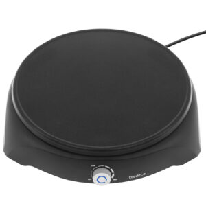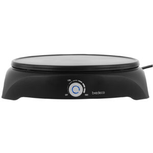 Elektryczna naleśnikarka niemieckiej marki Bredeco jest urządzeniem, które sprawdzi się w domowej kuchni. Model BCEC-1250-R posiada sporą płytę grzewczą o średnicy 30 cm ze specjalną ochroną zapobiegającą wylaniu się ciasta. Temperaturę grzania ustawia się w zakresie ok. 70C – 190C. Duża moc 1250W pozwala na wydajne i szybkie smażenie naleśników, placków, racuchów itp.