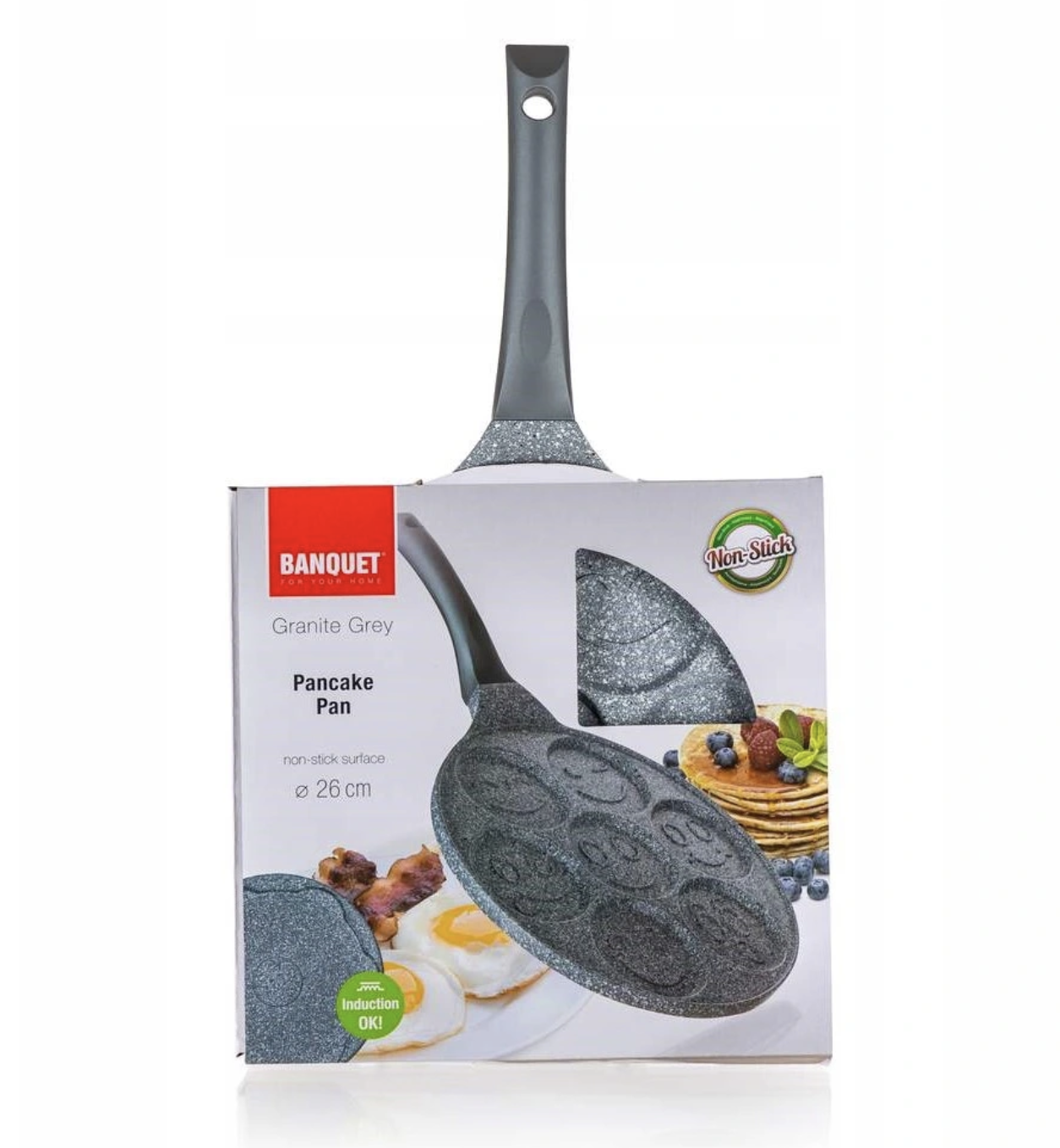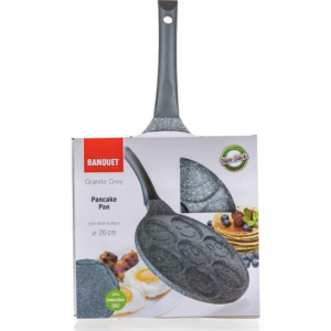 Patelnia do naleśników z formami na 7 naleśników o średnicy 8 cm. Banquet Patelnia do naleśników GRANITE GREY Smile 26 cm jest wykonana z aluminium z dwuwarstwową nieprzywierającą powierzchnią Dyflon i posiada dno indukcyjne z warstwą oporną na ciepło.