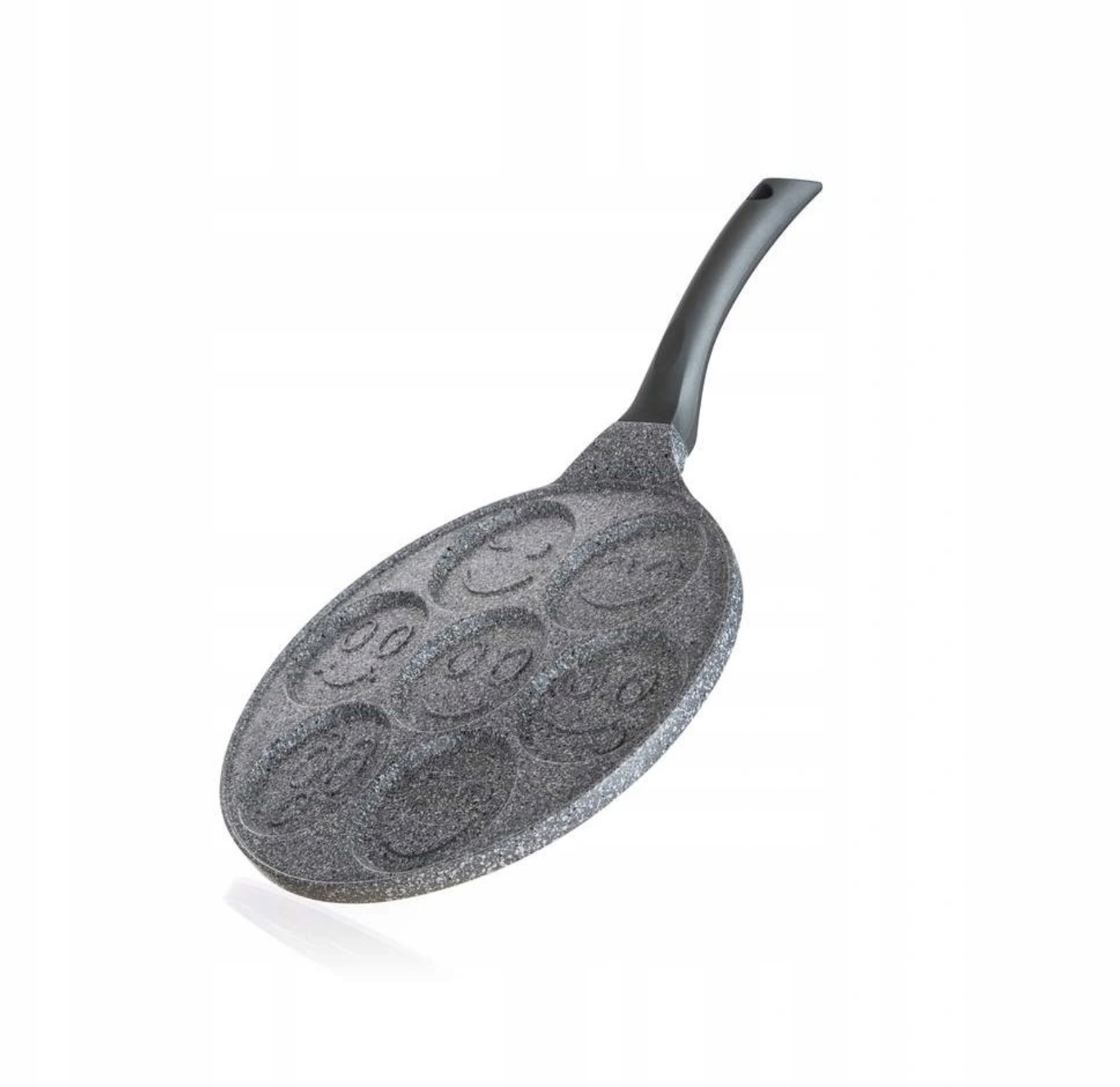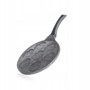 Gruba (4mm) patelnia dołkownica z granitową powłoka nieprzywierająca. Idealna do przygotowania jajek sadzonych placuszków pancakeów czy naleśników z wesołym motywem buziek.
