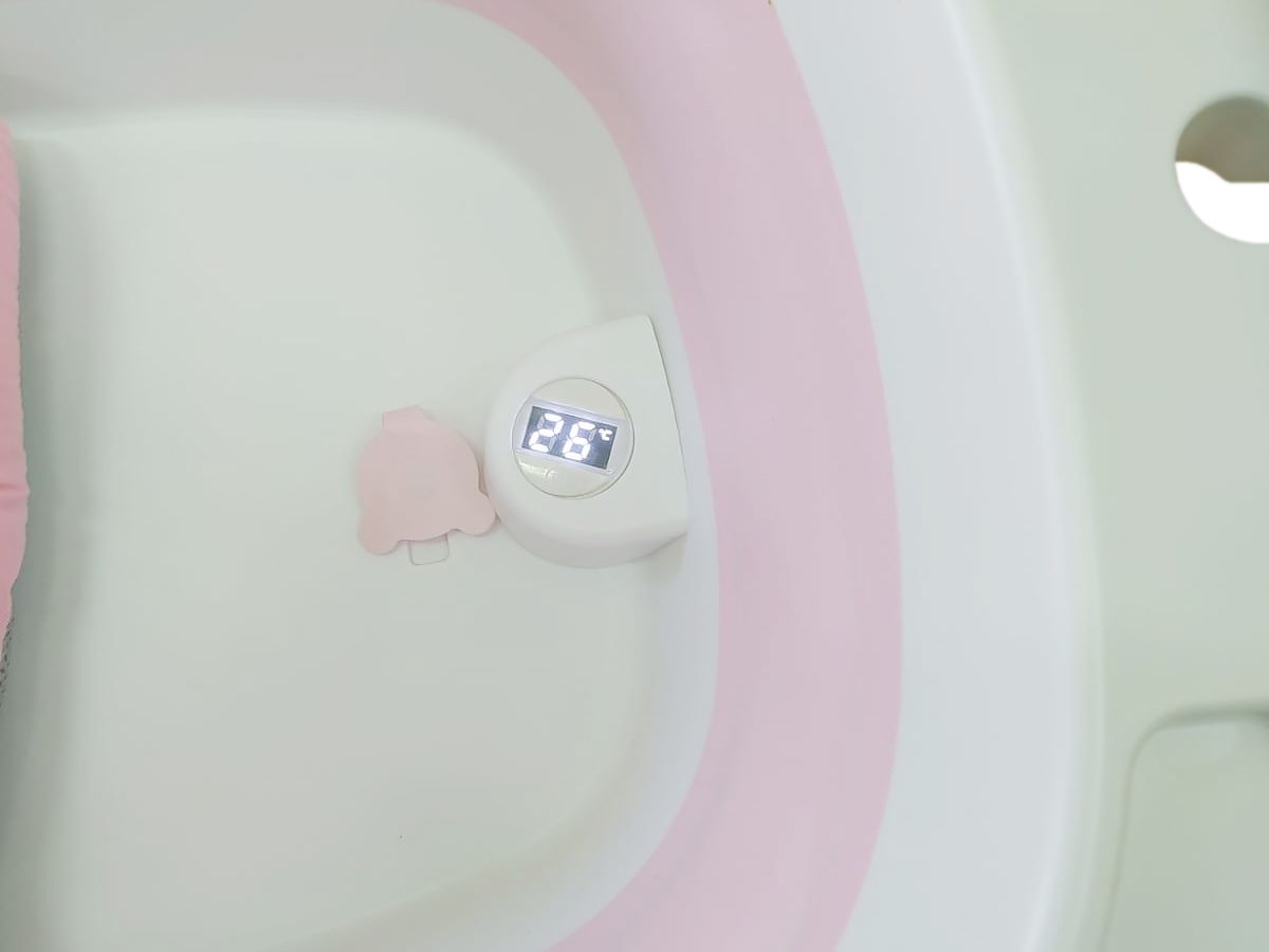 Wanienka wyposażona jest w termometr który umożliwia kontrolę temperatury wody oraz dołączoną poduszkę w kształcie misia.