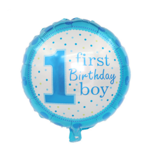 - Niebiesko-biały balon z napisem First Brithday Boy – 2szt