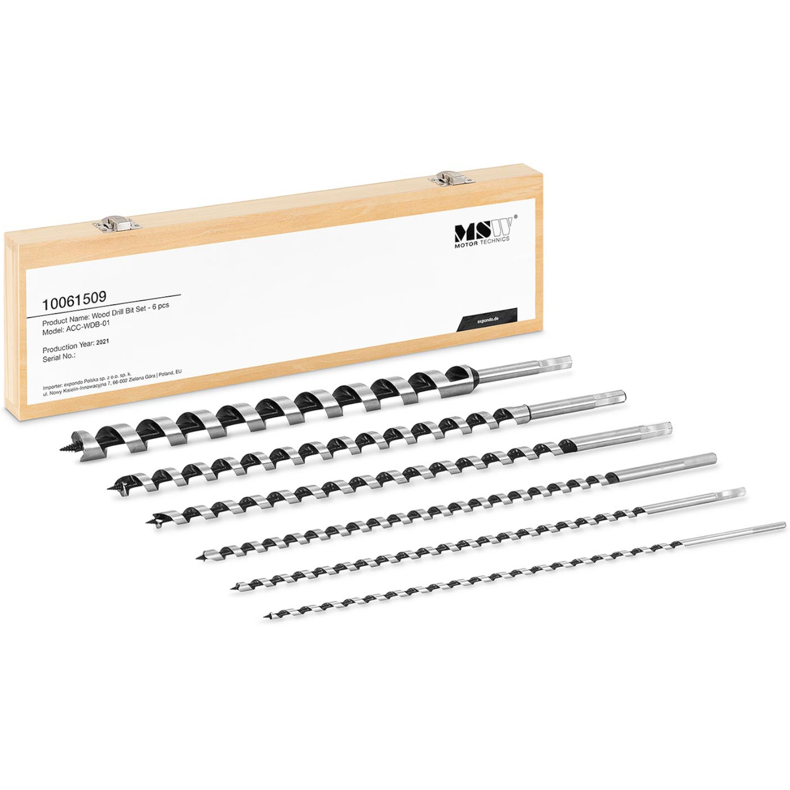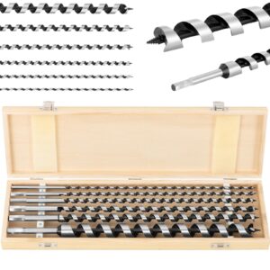 Komplet wierteł do drewna marki MSW sprawdzi się do wykonywania otworów w drewnie twardym i miękkim, w legarach, płytach wiórowych czy w sklejkach. Sześciokątny trzpień pozwala zamontować wiertło w uchwycie wiertarskim. Narzędzia wykonane zostały ze stali węglowej o wysokiej odporności na zużycie. Rowek wiórkowy sprawia, że drewniane wióry są sprawnie usuwane. W zestawie znajduje się 6 wierteł o długości 460 mm: 6, 8, 10, 12, 14, 16, 25 mm oraz drewniane pudełko do ich przechowywania.