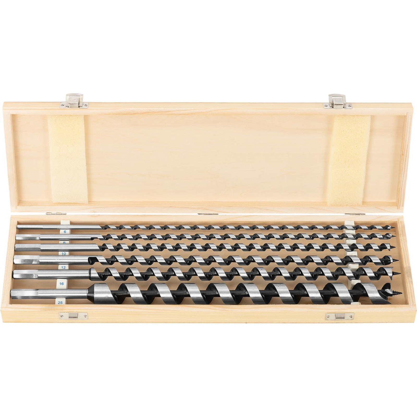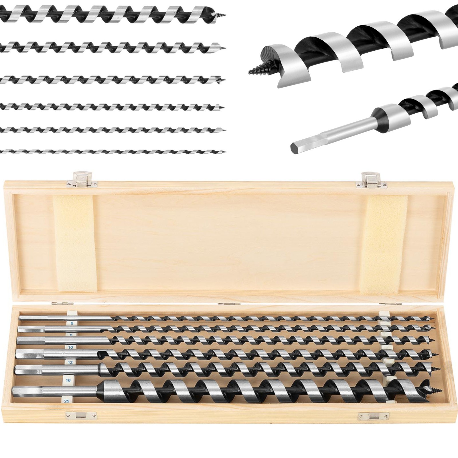 - – 6 wierteł do drewna o średnicach 6,8,10,12,14,16,25 mm i długości 460 mm,